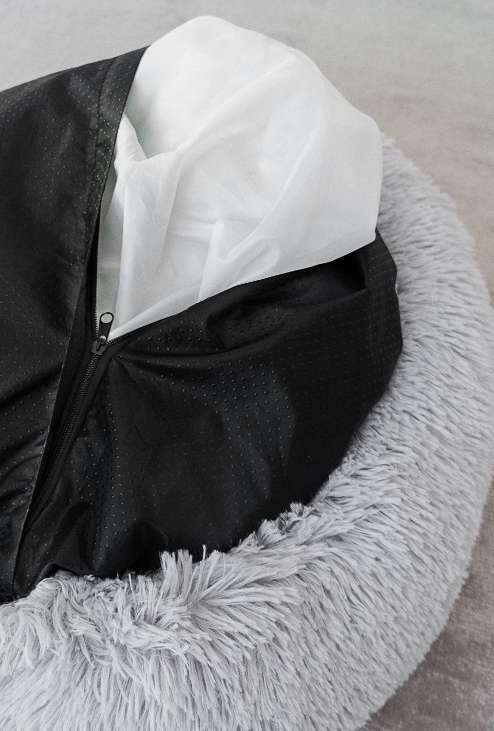 Det avtagbara överdraget har en dold dragkedja och kan enkelt tvättas i maskin, vilket gör rengöringen smidig och hygienisk. Den halkfria, fukttåliga botten gör dessutom att bädden ligger stadigt på plats, oavsett golvtyp.
